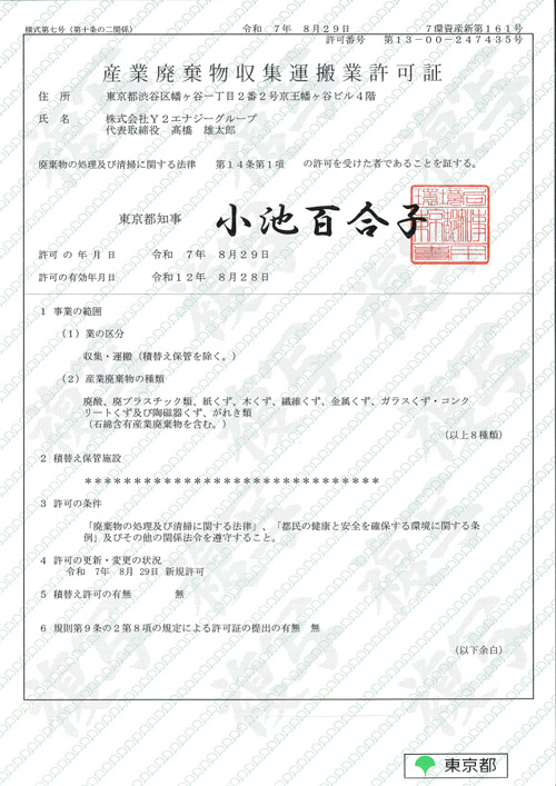 産業廃棄物収集運搬業許可証を取得しました。