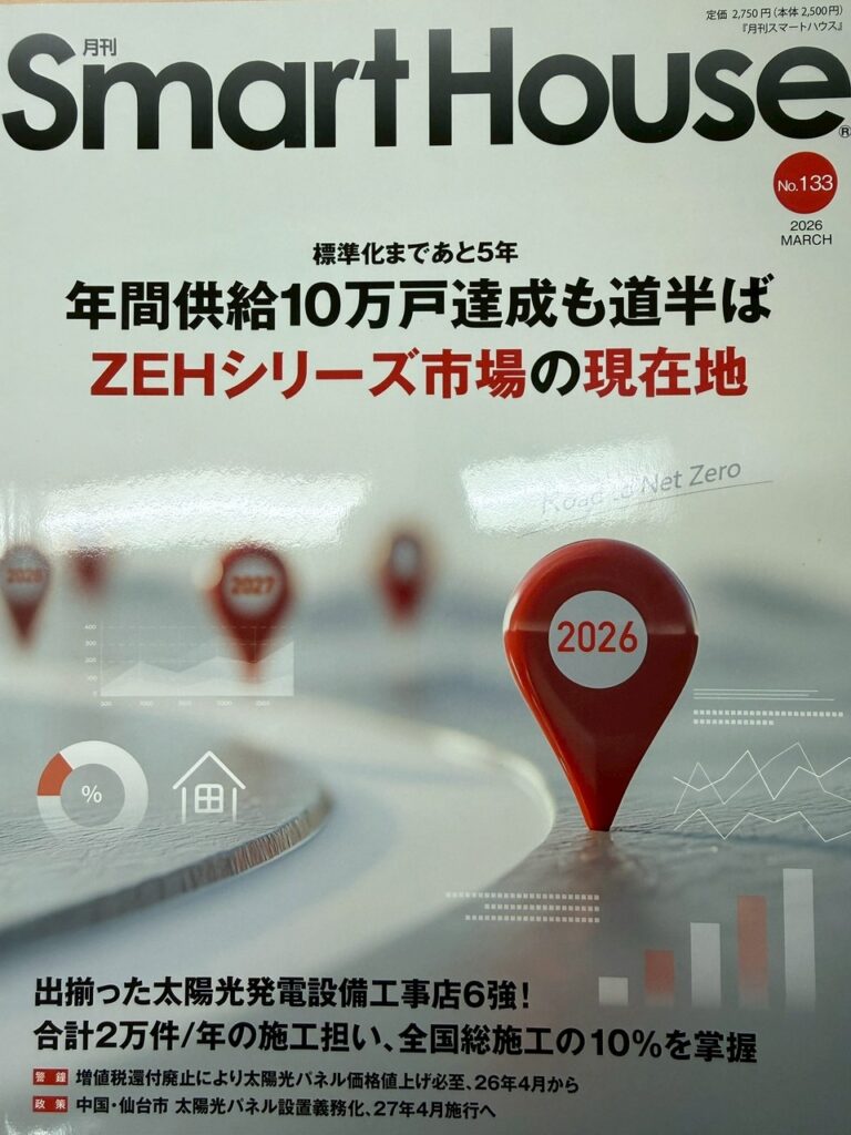 お知らせ NEWS ホーム お知らせ 【業界誌掲載のお知らせ】 2026.03.02 【業界誌掲載のお知らせ】 太陽光・再生可能エネルギー業界専門誌 『Smart House 2026年3月号』に 弊社ロゴが掲載されました。 ZEH・太陽光市場の最前線を特集する専門誌に 掲載いただけたこと、大変光栄に思います。 これからも “安心・高品質施工”を徹底し 地域No.1のエネルギー企業を目指します。 今後とも宜しくお願い申し上げます。 株式会社Y2エナジーグループ 一覧へ戻る